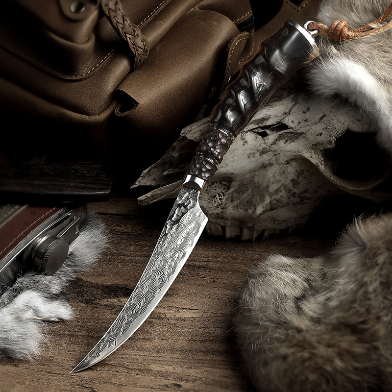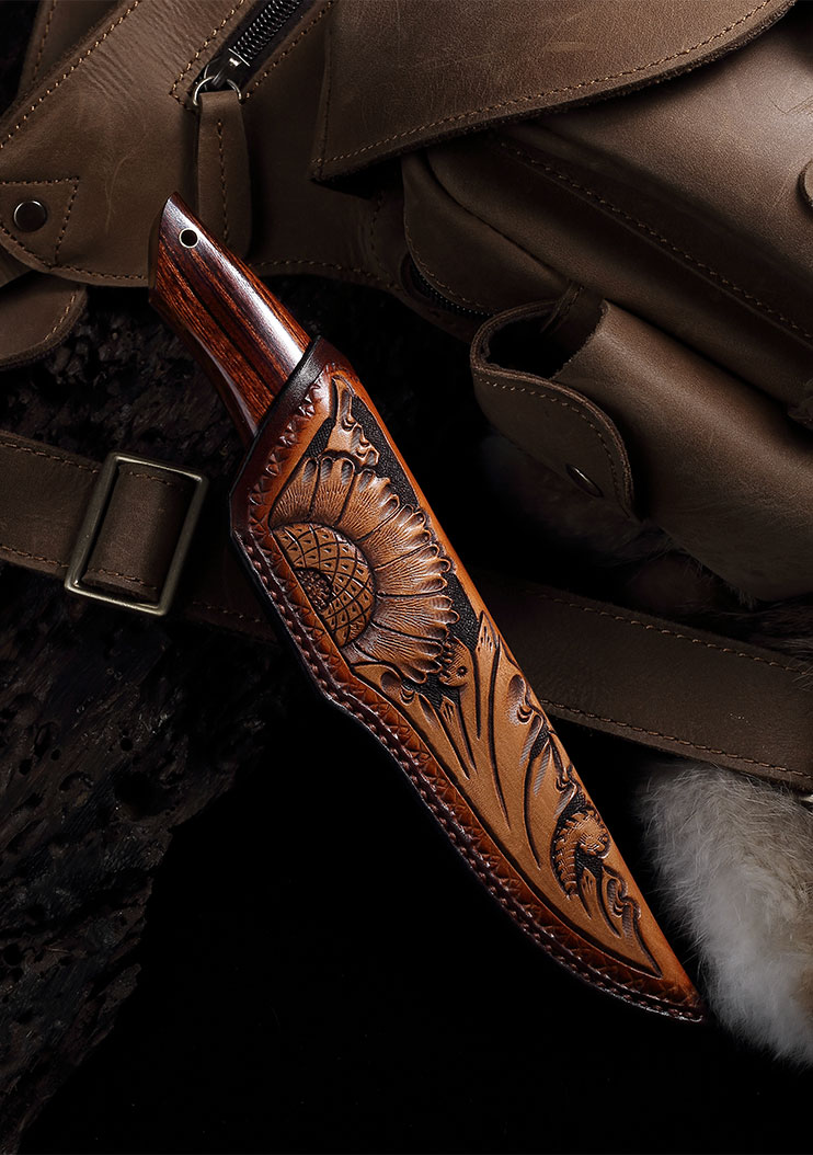 刀刃由乌兹钢.大马士革打造,硬度高,保持刀刃锋利持久;手柄是沙漠铁木+铝合金组成,每一把都有其独特的纹路,颜色鲜艳且有质感。配上皮的刀套,更是加强了其的高贵,也更好地保护好刀刃。具备收藏价值,您会喜欢吗?