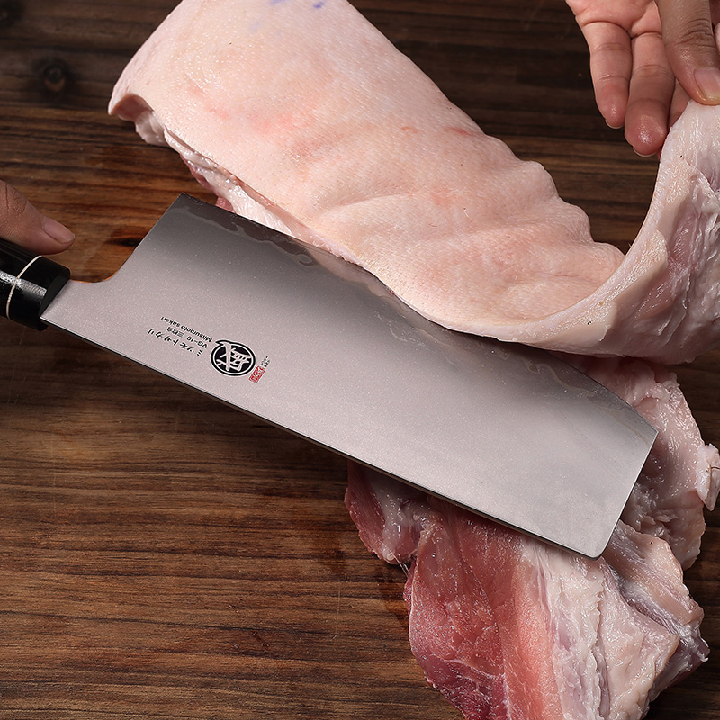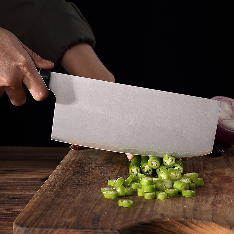 切片刀:中式菜刀是中式家庭里最常见的经典厨刀。可用于大部分食材的处理,除了带骨肉外,日常切肉、切菜、片鱼片、拍黄瓜等等,满足日常各种切配需求。它和西式厨刀的区别在于它的刀面较宽,符合中国人的烹饪习惯,可以拍蒜、剁肉,切菜后把食材一把刮起丢进锅里,这是刀面较窄的西式厨刀很难做到的。